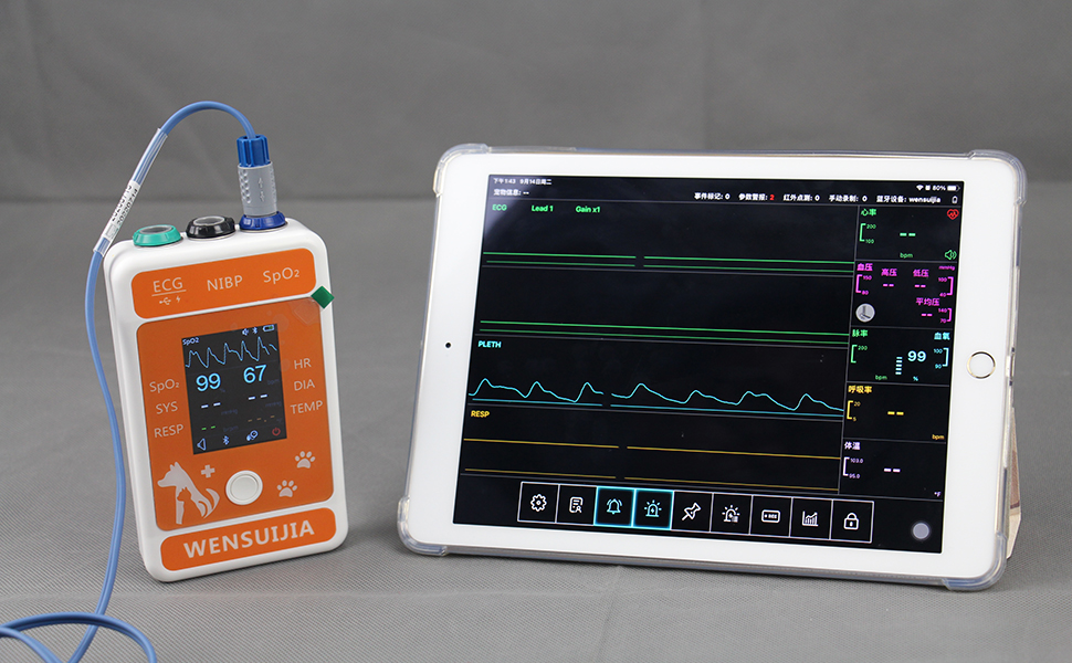 The Veterinary Patient Monitor is a state-of-the-art multi-parameter device designed for pet care, accurately measuring vital signs such as ECG, SpO2, NIBP, respiration, heart rate, and temperature. With a user-friendly 2.4'' TFT LCD display, built-in Bluetooth for smart device connectivity, and a free app for remote monitoring, this portable and lightweight monitor is perfect for veterinary professionals and pet owners alike.