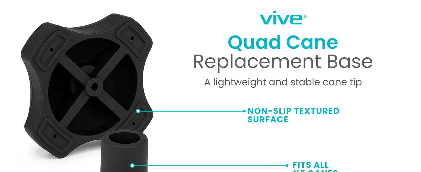 The Vive Self Standing Walking Cane Tip is a durable, rubber quad-base replacement designed for 3/4 inch canes. It offers superior stability with four contact points and textured grip for all-terrain use, while its flexible, lightweight design reduces hand fatigue. Compatible with most folding and standard canes, it keeps your cane upright for easy access and is HSA/FSA eligible with a 60-day guarantee.