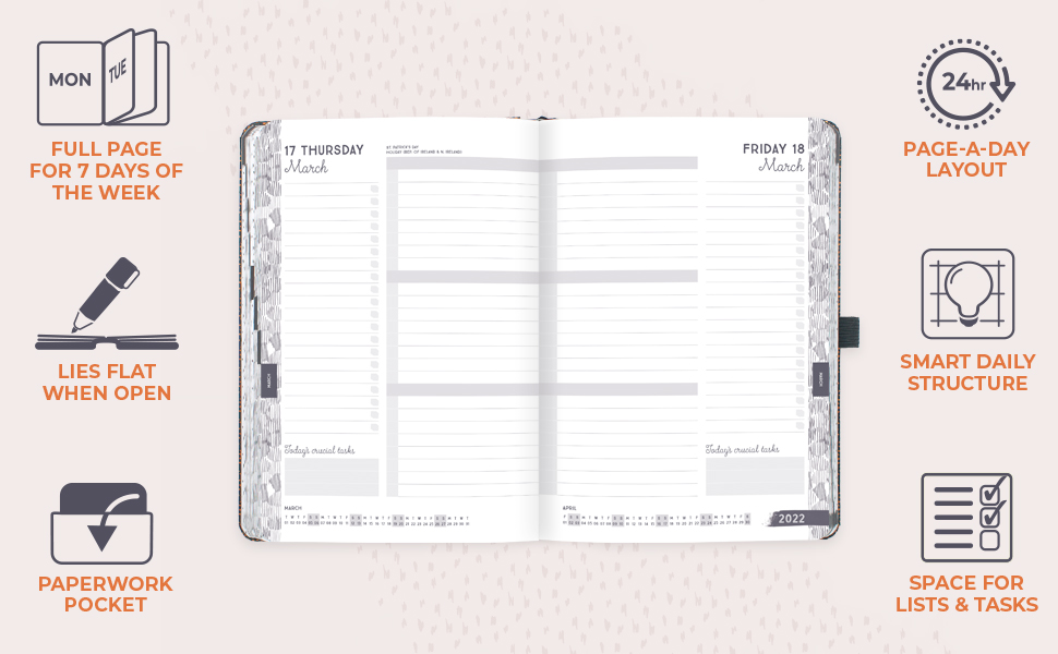 The Boxclever Press Perfect Year A5 Academic Diary 2024-2025 offers a premium faux leather cover with a smart day-to-page layout, designed to streamline busy professional lives. Featuring dedicated sections for appointments, to-do lists, and crucial tasks, plus weekend full-page spreads, it ensures comprehensive daily planning. Additional touches like ribbon markers, pen loop, elastic closure, and a pocket make it the ultimate organizational tool for millennial managers aiming to stay ahead.