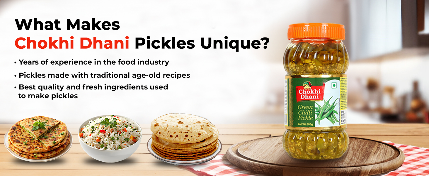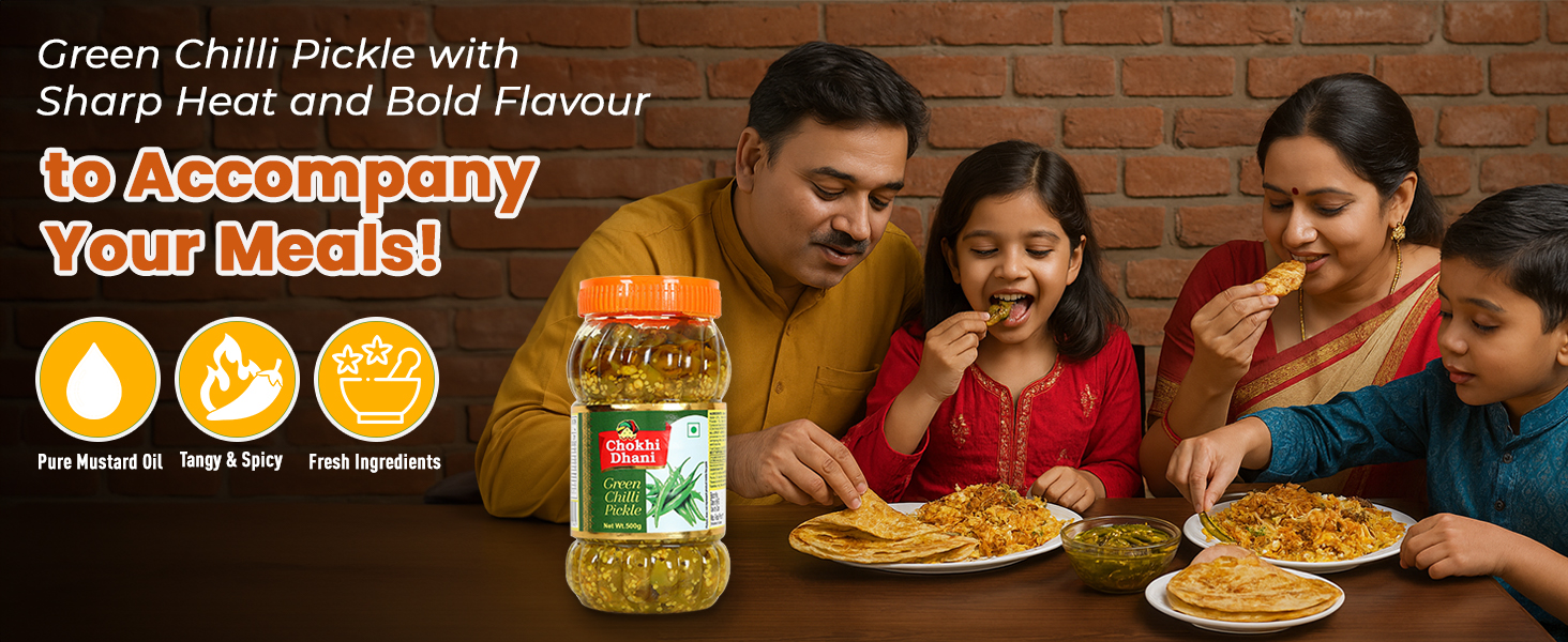 Chokhi Dhani Green Chilli Pickle is a 500g jar of authentic Indian pickle crafted from 77% fresh green chillies and mustard oil, following a traditional Rajasthani recipe. Free from artificial colors and flavors, it delivers a spicy and tangy flavor profile, sealed for freshness and perfect for enhancing a variety of Indian dishes.