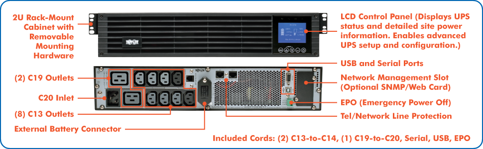The Tripp Lite SUINT3000LCD2U is a robust 3000VA/2700W smart online UPS designed for mission-critical applications. It delivers zero transfer time between power modes, supports extended runtime via external batteries, and offers advanced network management options. ENERGY STAR certification ensures energy-efficient, cost-effective protection for your essential electronics.