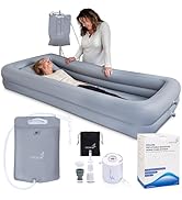 I ordered this inflatable tub for my husband as he has ALS and is not able to be bathed or showered normally. We found this to be a godsend! It took more time than we anticipated the first time, but we learned a few things that helped the process go more smoothly. What you should know to be prepared : purchase a cheep little water pump to drain the tub. I spread the tub out on top of the hospital bed. lay out the tiny little air pump (it does the job, but is tiny). set up the water pump so it’s ready and you just plug in when needed. Set up the Towels, washcloths and body wash etc. have #5 five gallon buckets full of warm water ready. have person lay on the tub. air it up using the tiny air pump (this takes about 5 minutes) then bathe your person, when bath is finished plug water pump in using a hose to drain ( in our case, drain hose empties into the bath tub. there is a good amount of water that pools in the middle of the tub. We raise the head and the foot of the bed. pump out all you can and use a bath towel to soak up the rest. open air valves and begin to dry your person during deflation. remove the tub from the bed before or after your person is dressed. (depend on being bedridden or not). dry the tub as best you can and hang to dry in a place the doesn’t risk puncture. then wipe out a bucket roll up hose and electrical cord place them in the bucket for storage. plug in the tiny air pump. and charge it before putting it away in the storage bucket. This way it’s all handy for the next bath. We let the other buckets air dry and stack them afterwards. We definitely highly recommend this bathing system. it’s a game changer for those who can’t shower or get in and out of the tub. I do wish the air pump was bigger, but it does the job. I hope our review helps others